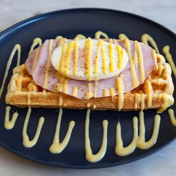 Liege Waffle with Blackforest Ham or Bacon, Cheese, Poached Egg served with our fresh Hollandaise Sauce